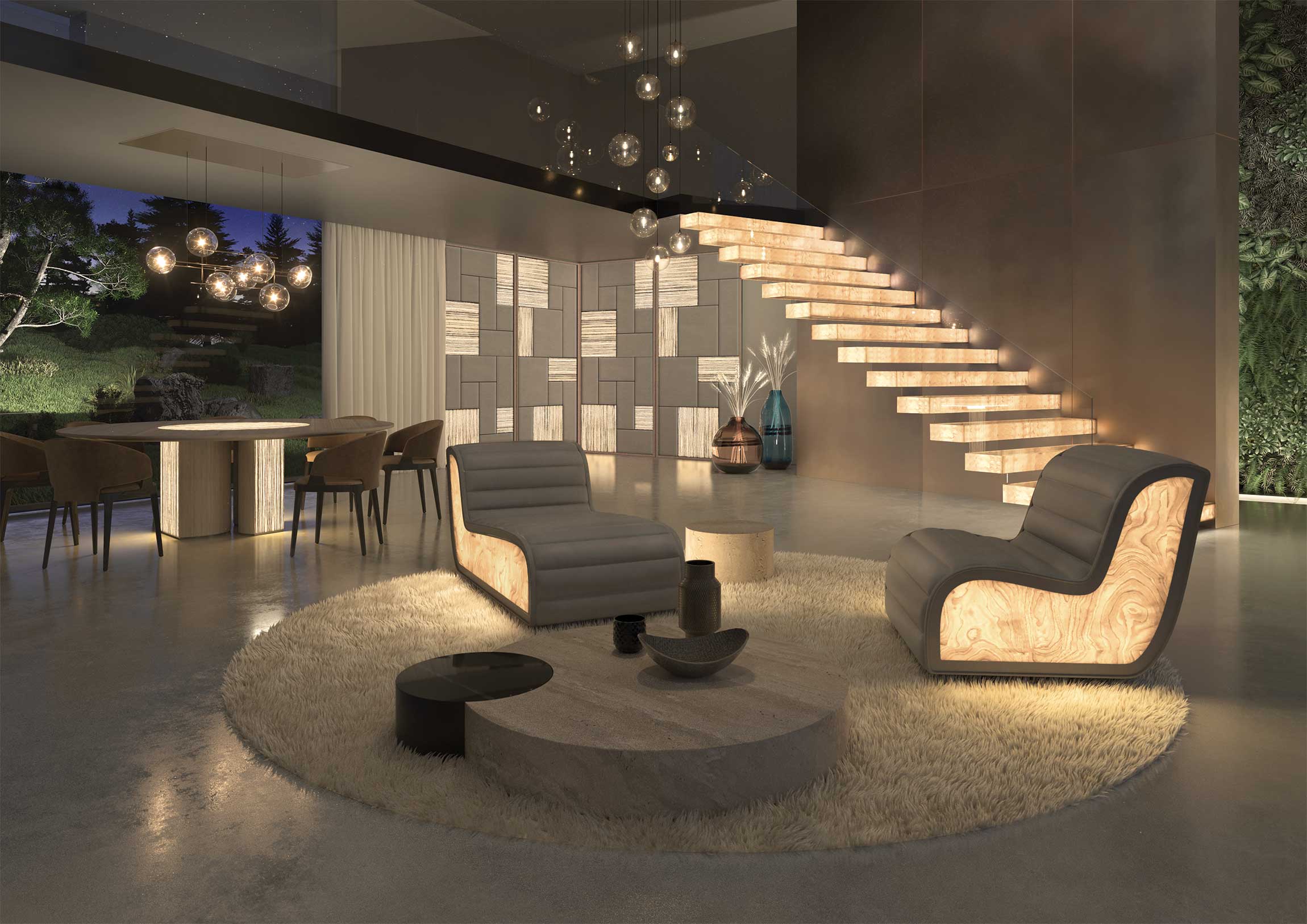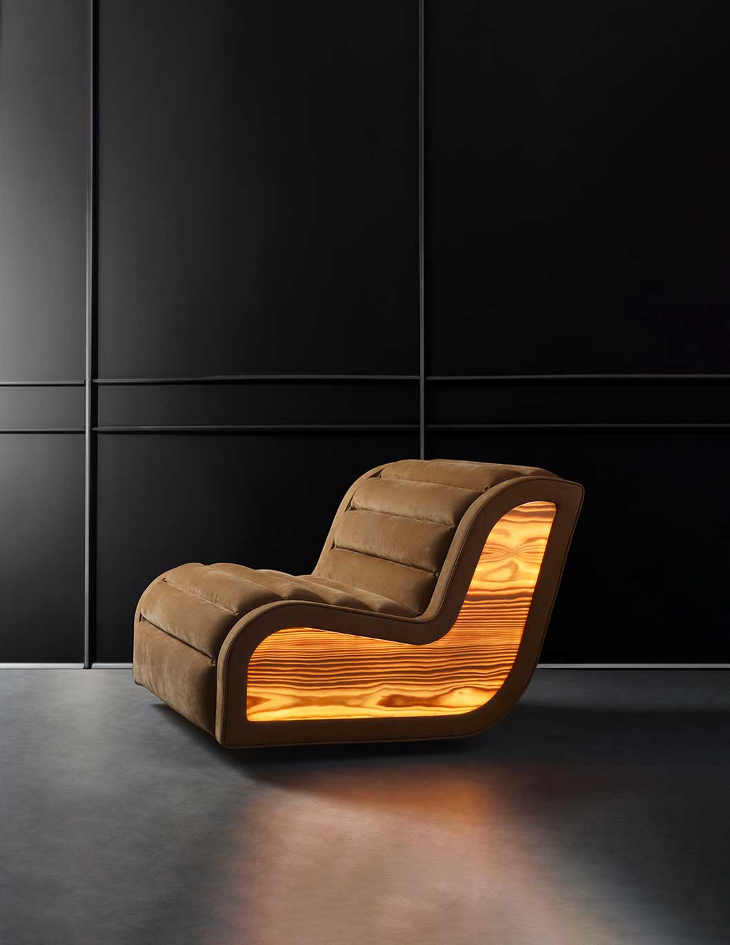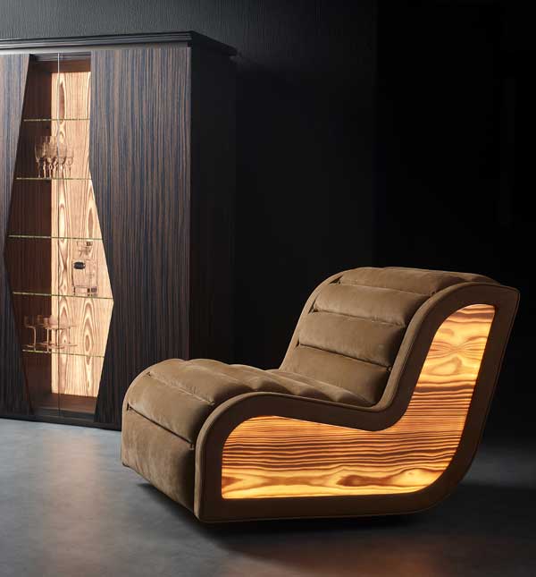 La poltrona Ippolita combina comfort ed eleganza con pannelli luminosi Brightwood® dimmerabili, design compatto e cuscino ergonomico, creando un arredo moderno e funzionale.
